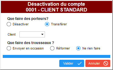 - La désactivation d'un compte client ouvre un formulaire demandant les traitements à réaliser pour les porteurs et les pièces.