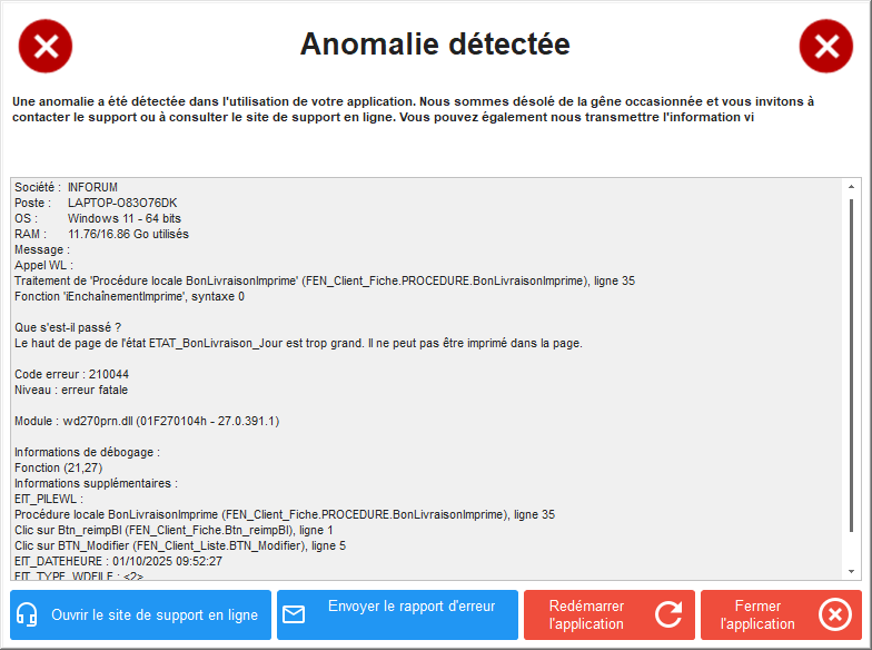 Affichage d'une erreur lorsqu'un bon de livraison est imprimé avec une imprimante qui ne supporte pas le format A4.