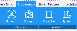 Un nouvel écran est disponible dans l'administration, onglet "Trousseaux", groupement "Vestiaires", bouton "Consulter". L'écran affiche la liste des porteurs associés à des vestiaires et permet de comparer la quantité maximale prévue par le vestiaire et la quantité réellement affectée. La configuration des vestiaires se fait maintenant via le bouton "Types".