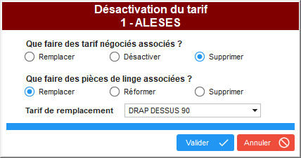 Les articles utilisés dans des bons de livraison et rattachés à des tarifs négociés et/ou des pièces ne peuvent plus être supprimés. Ils peuvent être désactivés à la place. Lors de la désactivation d'une référence article, un formulaire est affiché demandant à l'utilisateur ce qu'il convient de faire des tarifs négociés et/ou des pièces associées.